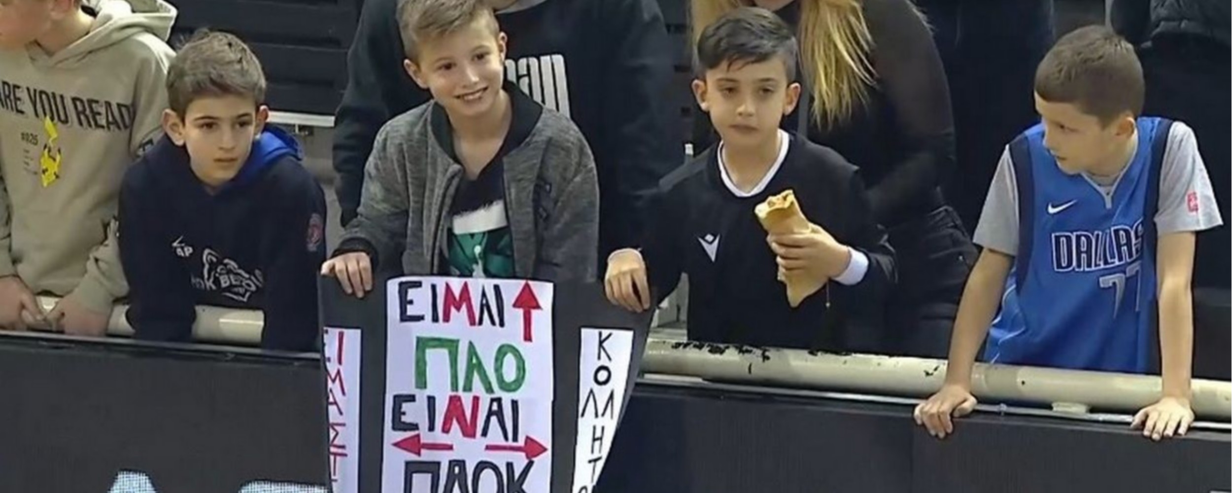 Το πλακάτ που είχαν φτιάξει οι δύο μικροί φίλοι του αθλήματος περιλαμβάνει όλο το νόημα του αθλητισμού: «Είμαστε κολλητοί. Είμαι ΠΑΟ, είναι ΠΑΟΚ. Μαζί για το μπάσκετ».