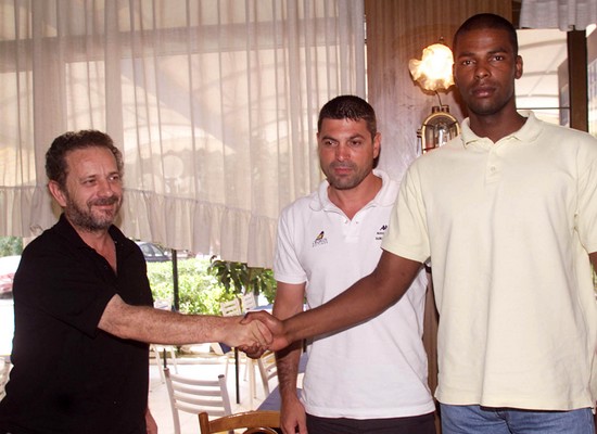 Στην παρουσίαση της μεταγραφής του Νέστωρα Κόμματου. Στο μέσον ο κόουτς Δημήτρης Τσολάκης