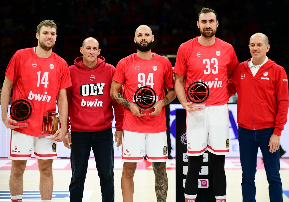 Οι ιδιοκτήτες της ΚΑΕ Ολυμπιακός Παναγιώτης και Γιώργος Αγγελόπουλος απένειμαν στους Σάσα Βεζένκοφ, Εβάν Φουρνιέ και Νίκολα Μιλουτίνοφ τα βραβεία τους για την Stoiximan GBL της περασμένης σεζόν πριν το τζάμπολ της αναμέτρησης των «ερυθρόλευκων» απέναντι στον Πανιώνιο για την 3η αγωνιστική της κανονικής περιόδου του Πρωταθλήματος.